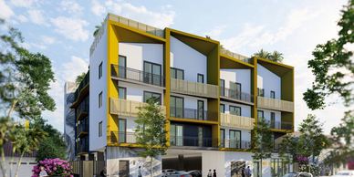 Complejo de apartamentos de 45 unidades con jardines exteriores, gimnasio y coworking.